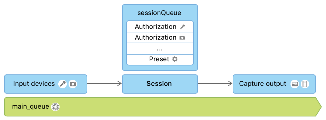 입력 및 출력을 포함하여 AVCaptureSession과의 모든 상호 작용을 전용 직렬 디스패치 대기열(sessionQue)에 위임하여 상호 작용이 기본 대기열을 차단하지 않도록 합니다.