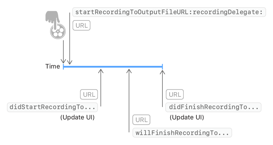 capturePhoto가 스틸 캡처를 위해 delegate 콜백을 트리거한 것처럼 startRecording은 동영상 녹화를 위한 일련의 delegate 콜백을 트리거합니다.