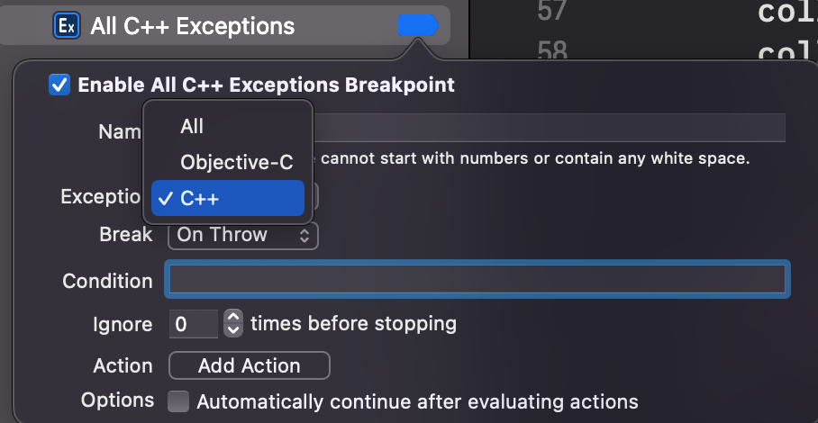 exception breakpoint를 추가해줍니다.