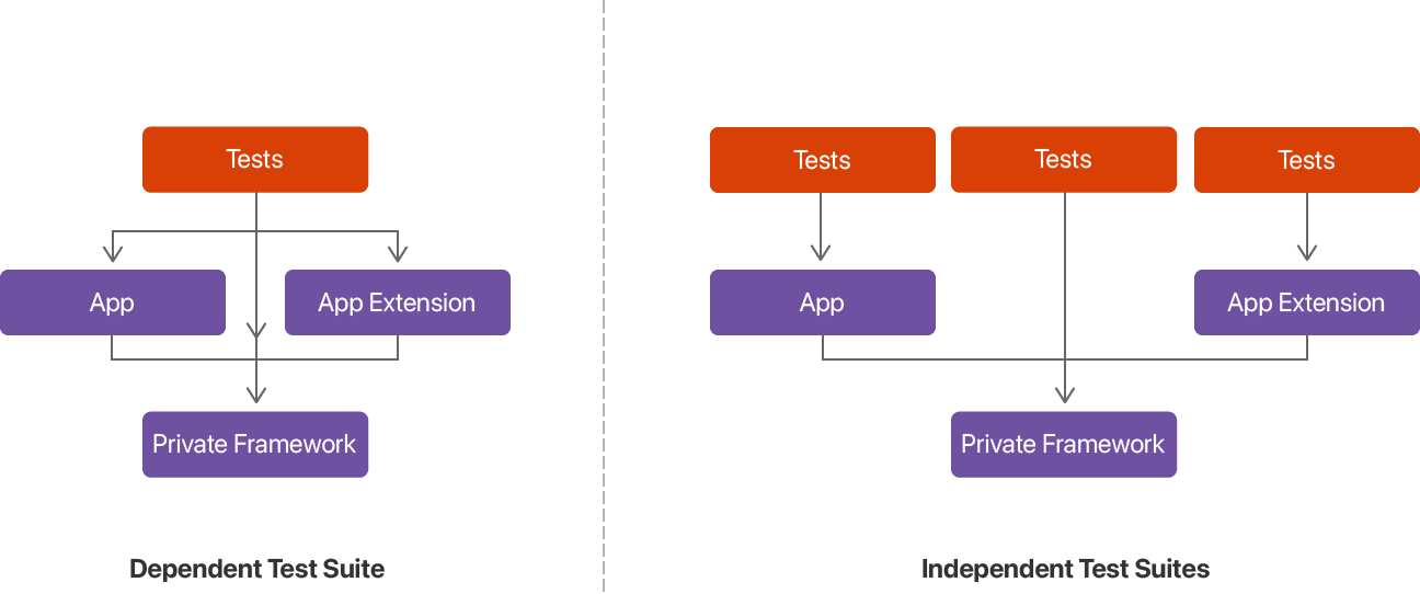앱, 앱 extension 및 개인 프레임워크에서 자동화된 테스트를 실행하는 단일 테스트 타겟을 고려하세요.