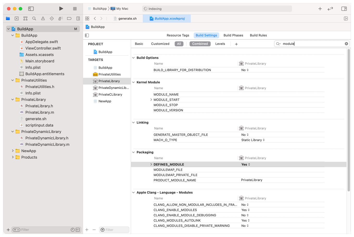 모듈 맵을 추가하려면 프레임워크 또는 라이브러리에 대해 DEFINES_MODULE 빌드 설정을 사용합니다.