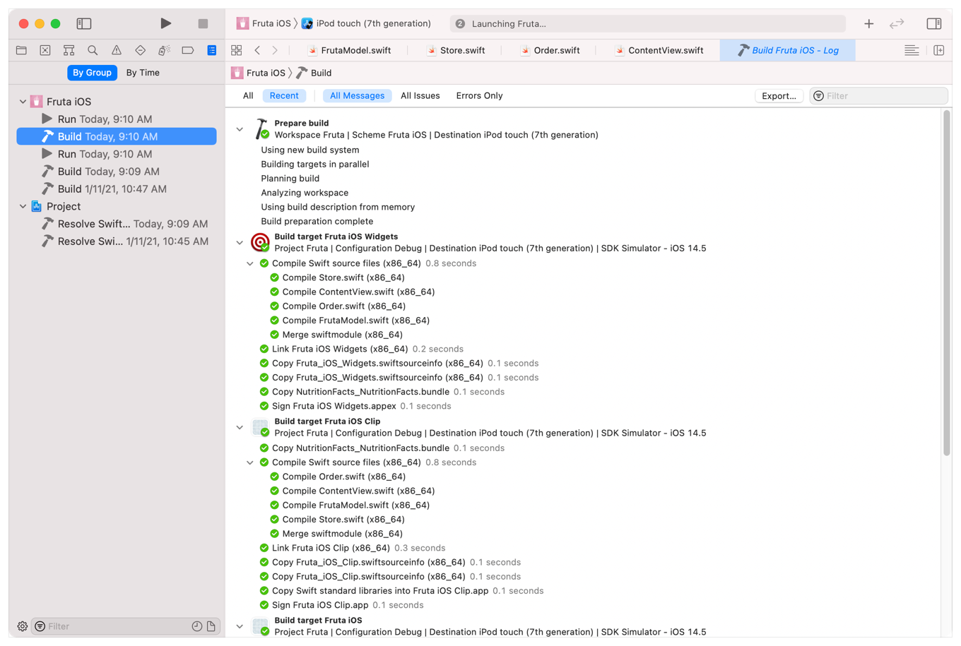 Xcode에서 프로젝트를 열고 Product > Perform Action > Build With Timing Summary를 선택하여 세부 타이밍 정보로 타겟을 구축합니다.