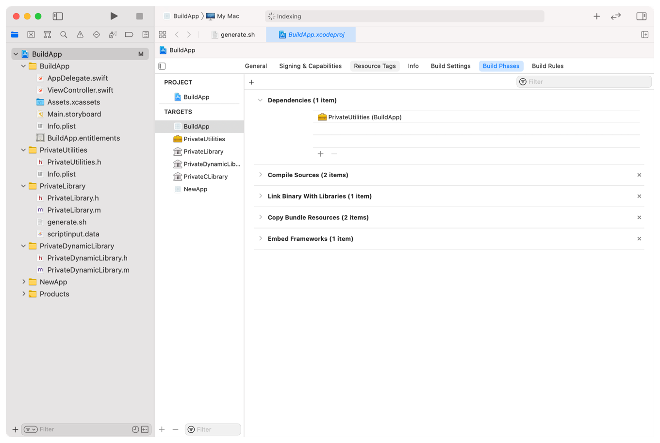 또한 다음과 같이 Dependencies build phase 편집기를 사용하여 종속성을 직접 지정할 수도 있습니다.