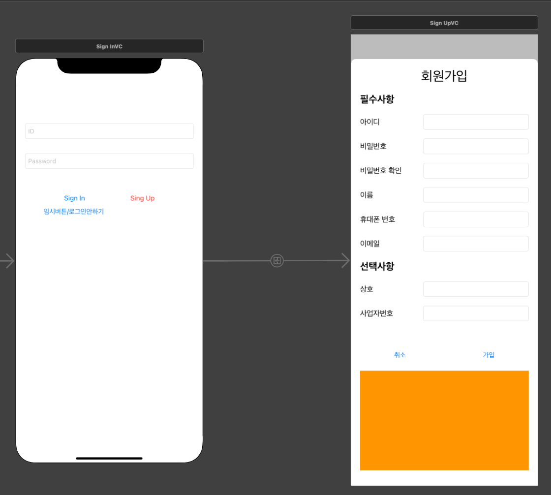 왼쪽 화면에서 임시버튼은 제가 테스트를 위해 만든 버튼이고, 오른쪽화면에서 선택사항은 입력하지 않아도 회원가입이 가능합니다.