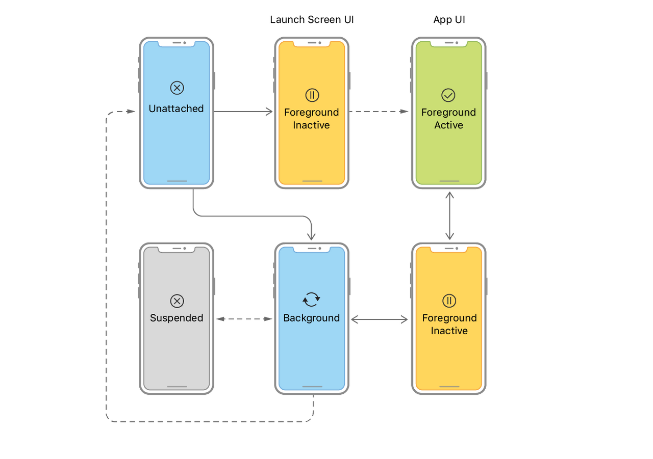 상용자가 앱의UI를 해제하면 UIKit은 관련된 씬을 백그라운드 상태로 이동하고 결국 suspended 상태로 이동합니다.