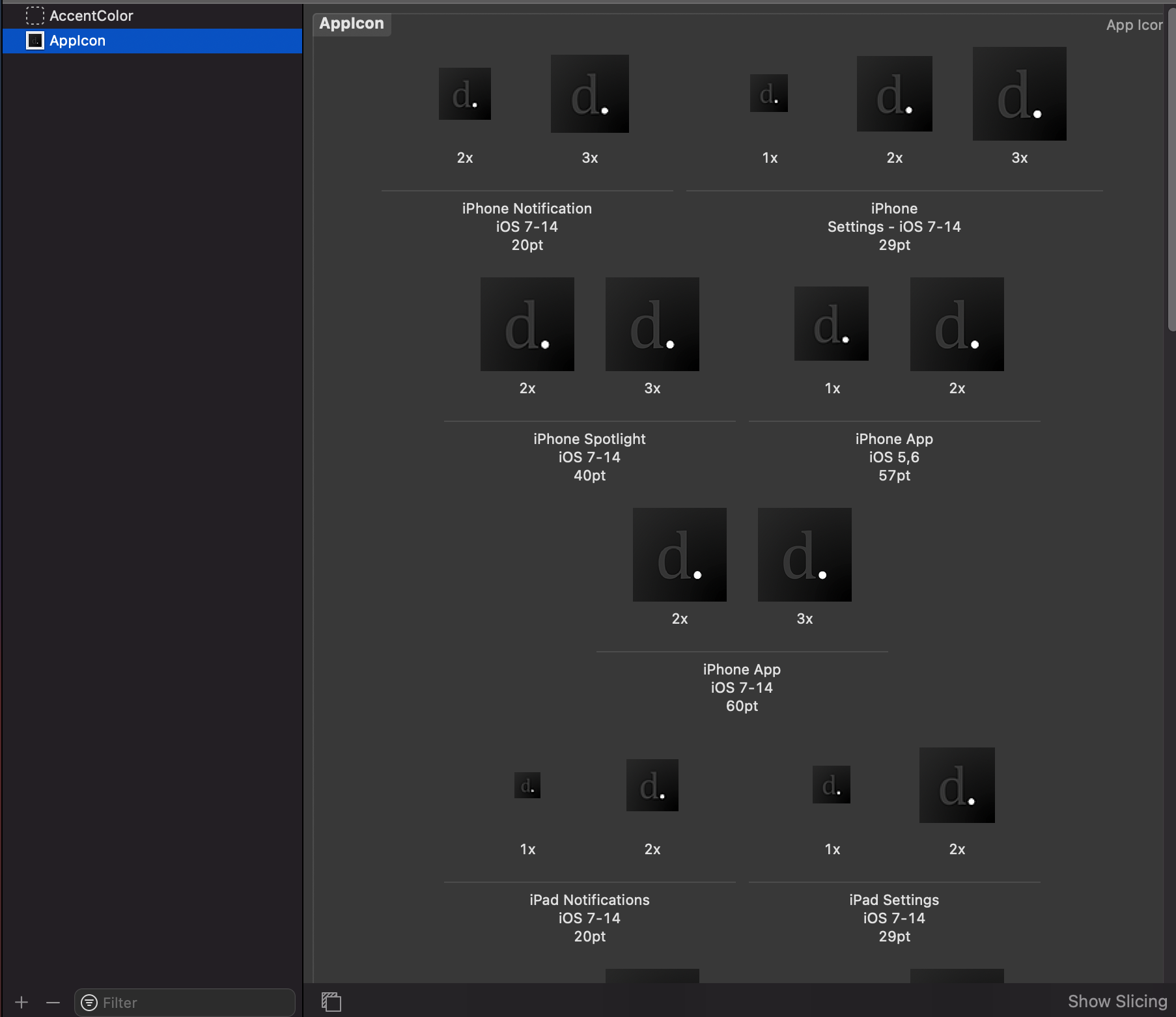 여기서 Assets.xcassets 폴더를 들어가면 AppIcon.appiconset가 나오는데 이것을 사용합니다.