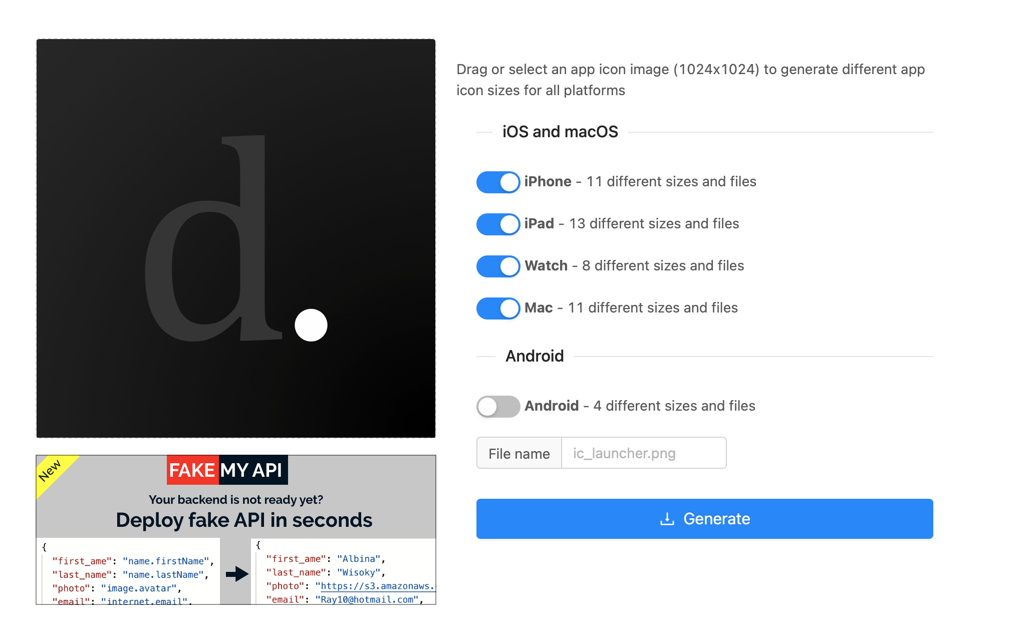 Generate icons and images for mobile apps, android and iOS. No need to upload or download. Works on your browser