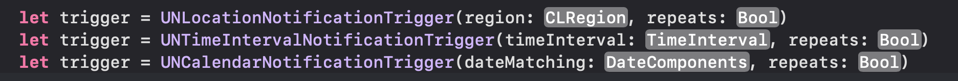 저는 UNCalendarNotificationTrigger를 사용했는데요. 정확한 날짜와 시간에 맞게 알람을 보내야하기 때문입니다.