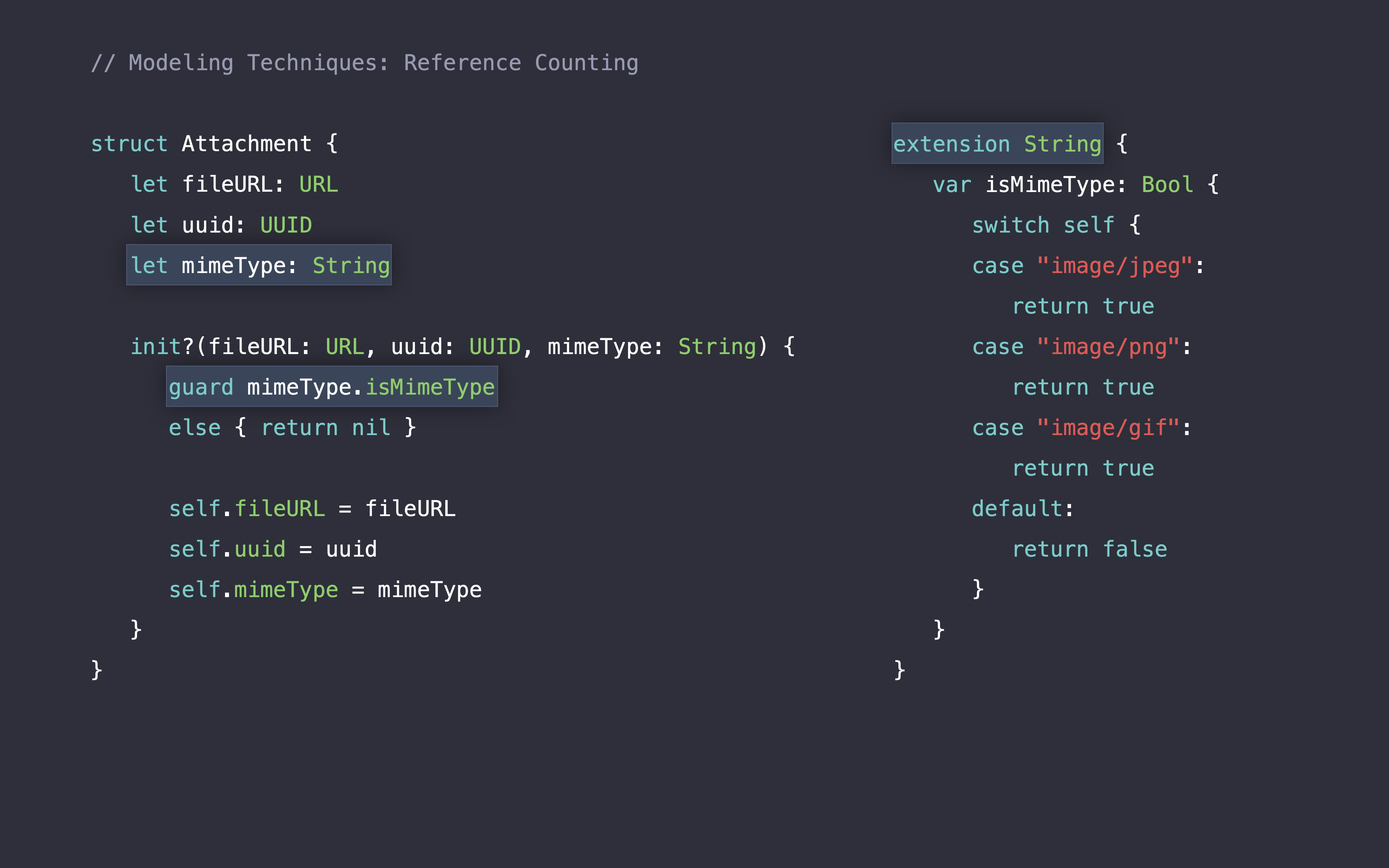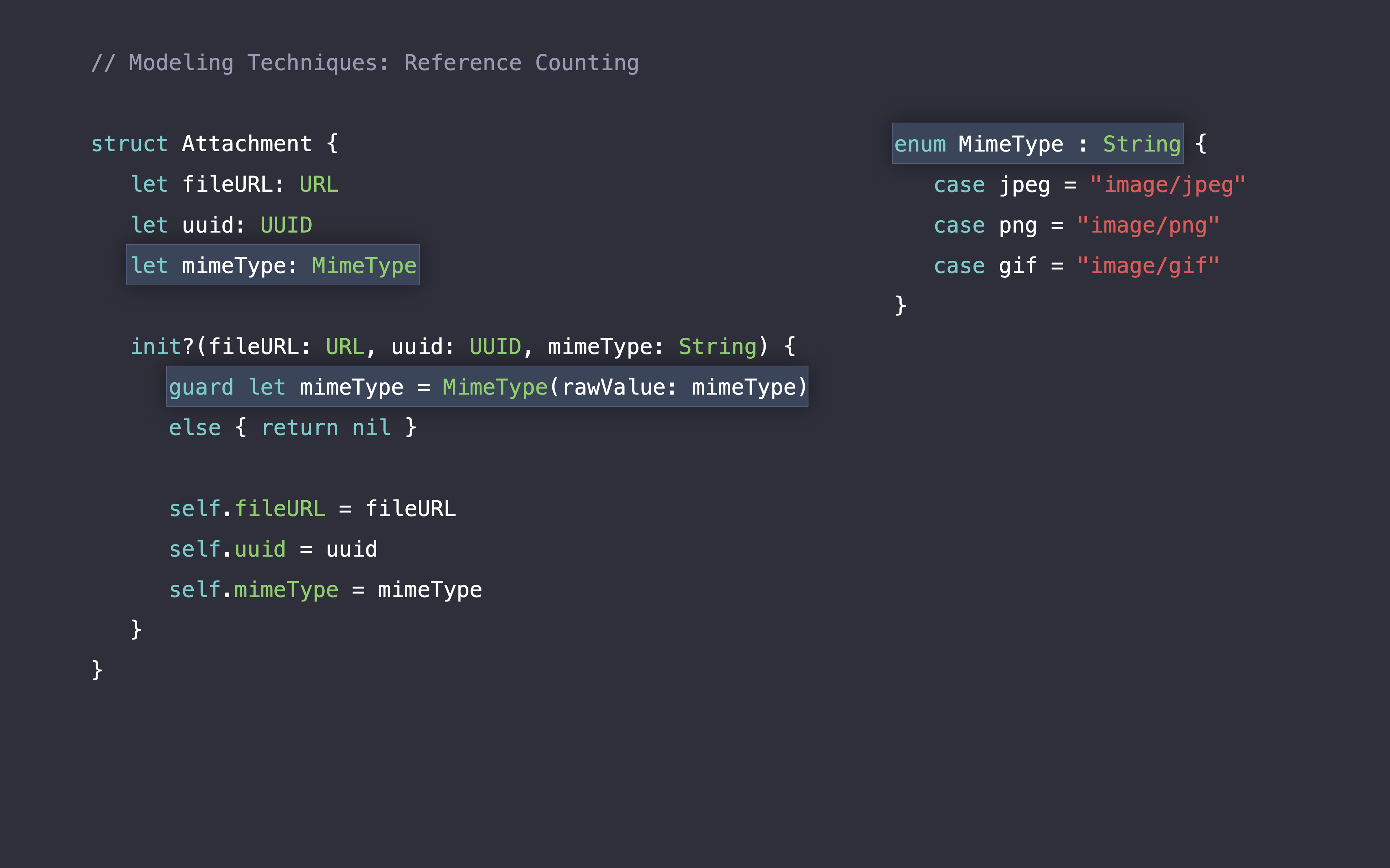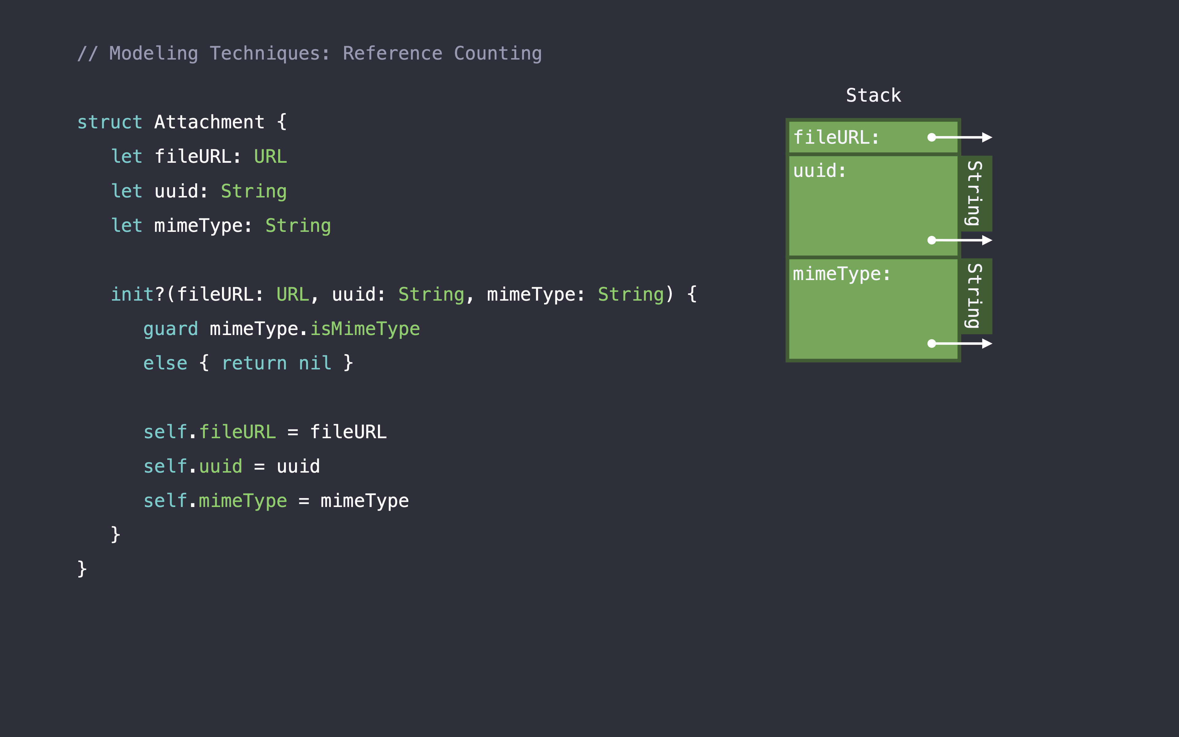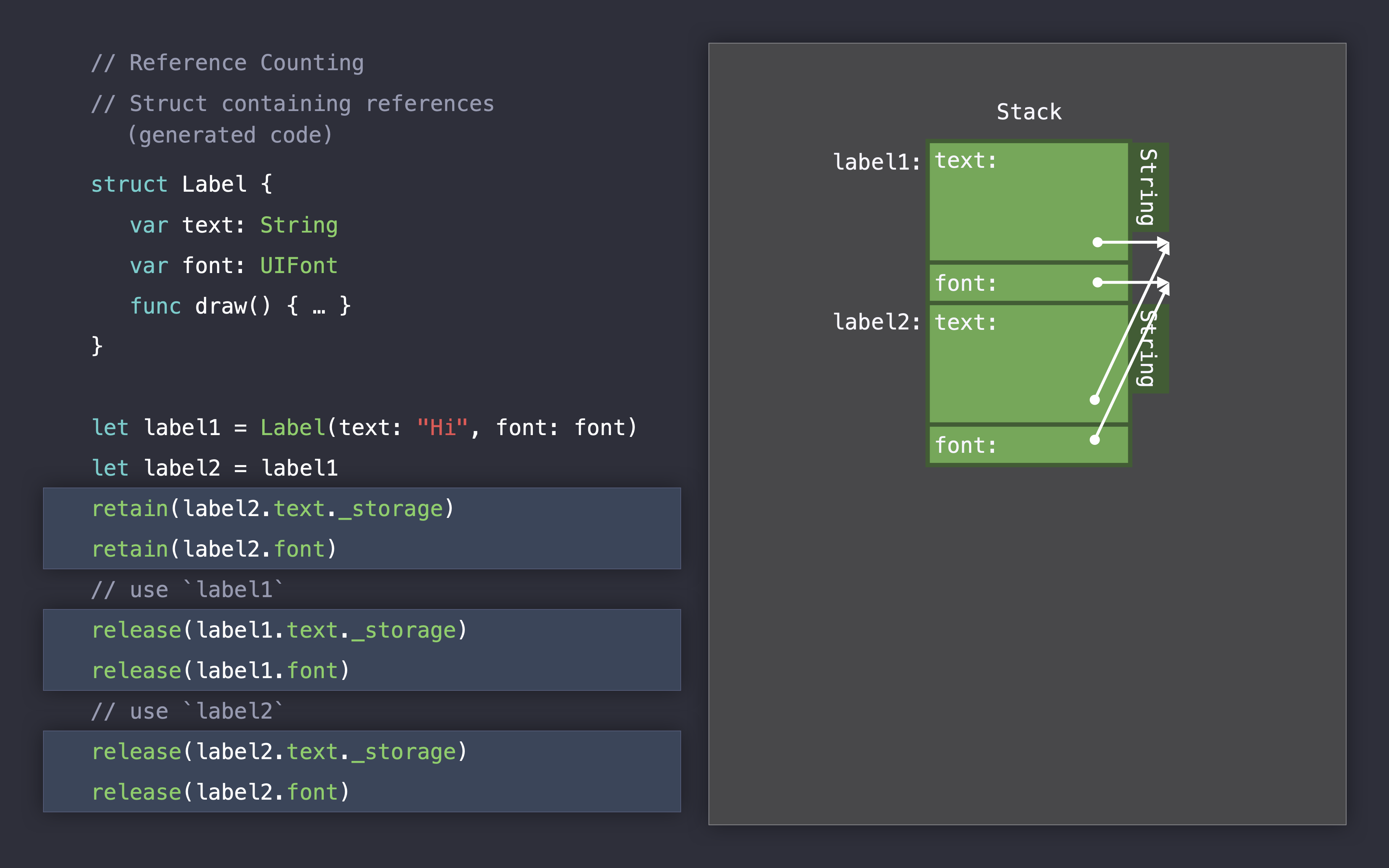 Here we have a label struct which contains text which is of type String and font of type UIFont. String, as we heard earlier, actually stores its -- the contents of its characters on the heap. So, that needs to be reference counted. And font is a class. And so that also needs to be reference counted. If we look at our memory representation, labels got two references. And when we make a copy of it, we're actually adding two more references, another one to the text storage and another one to the font. The way Swift tracks this -- these heap allocations is by adding calls to retain and release.