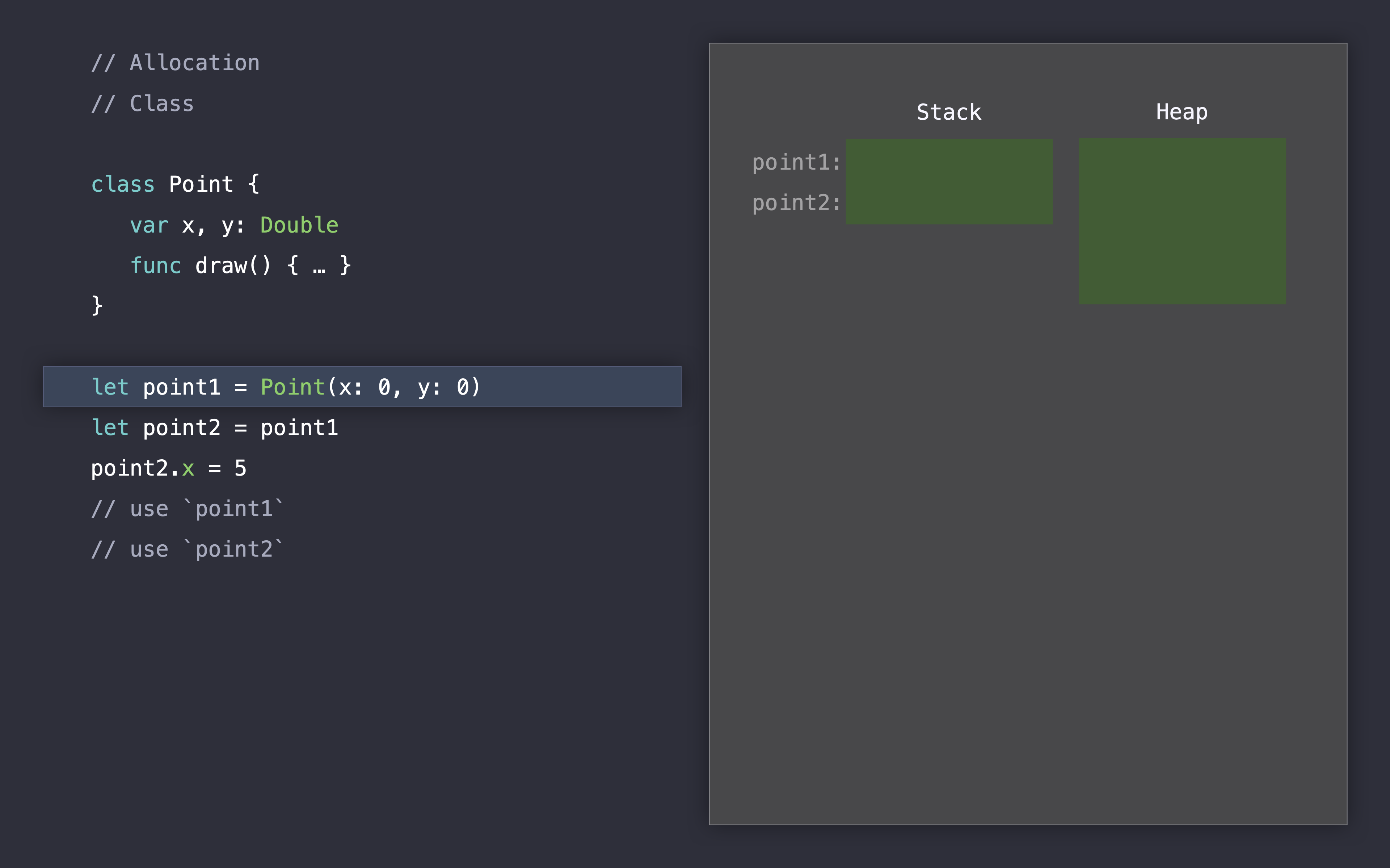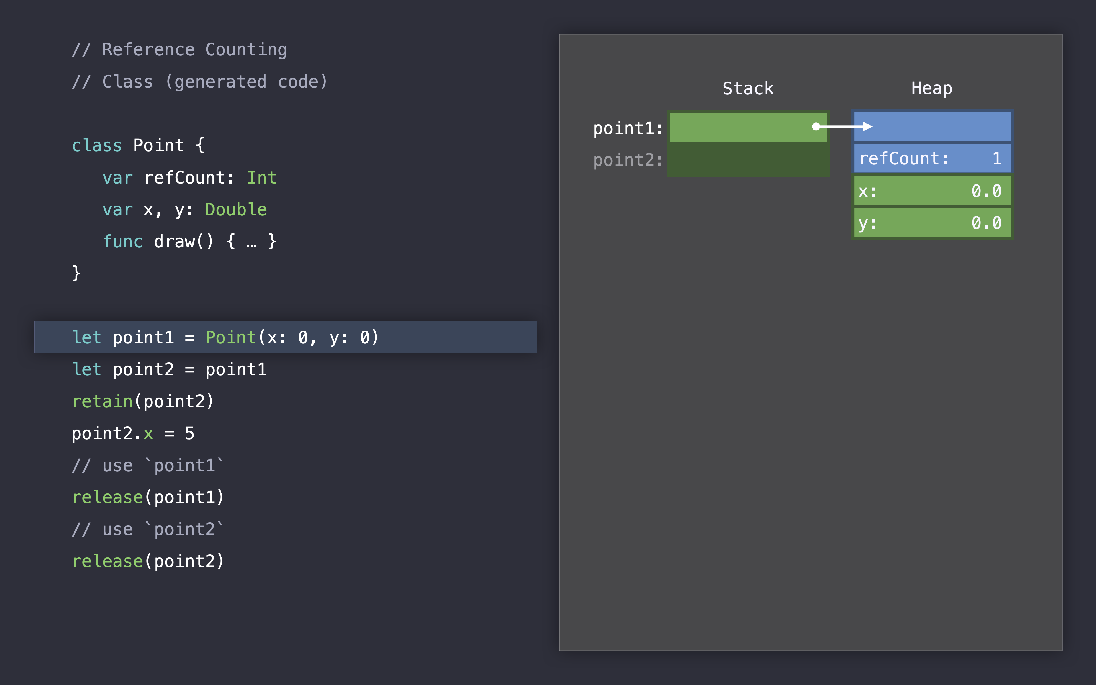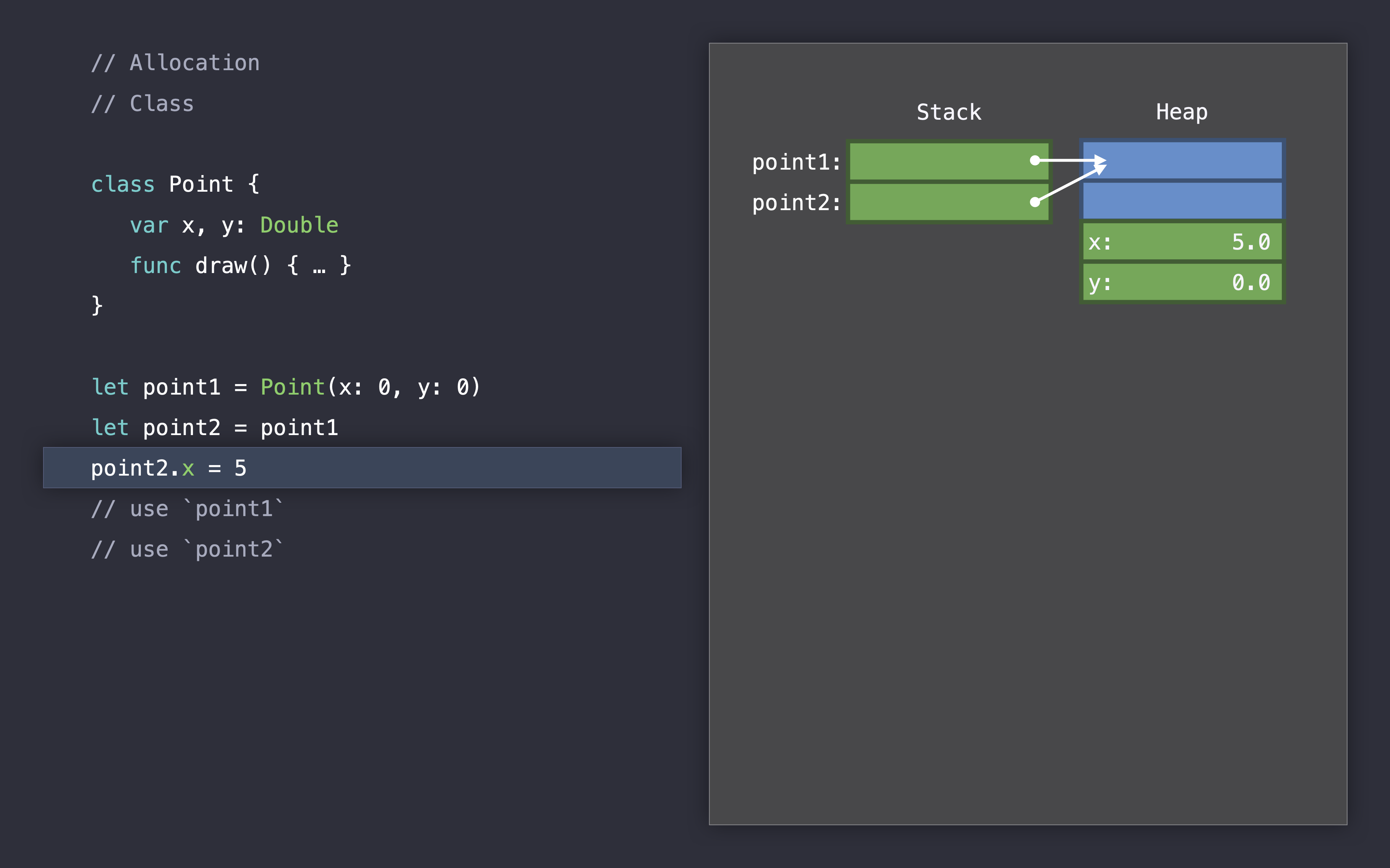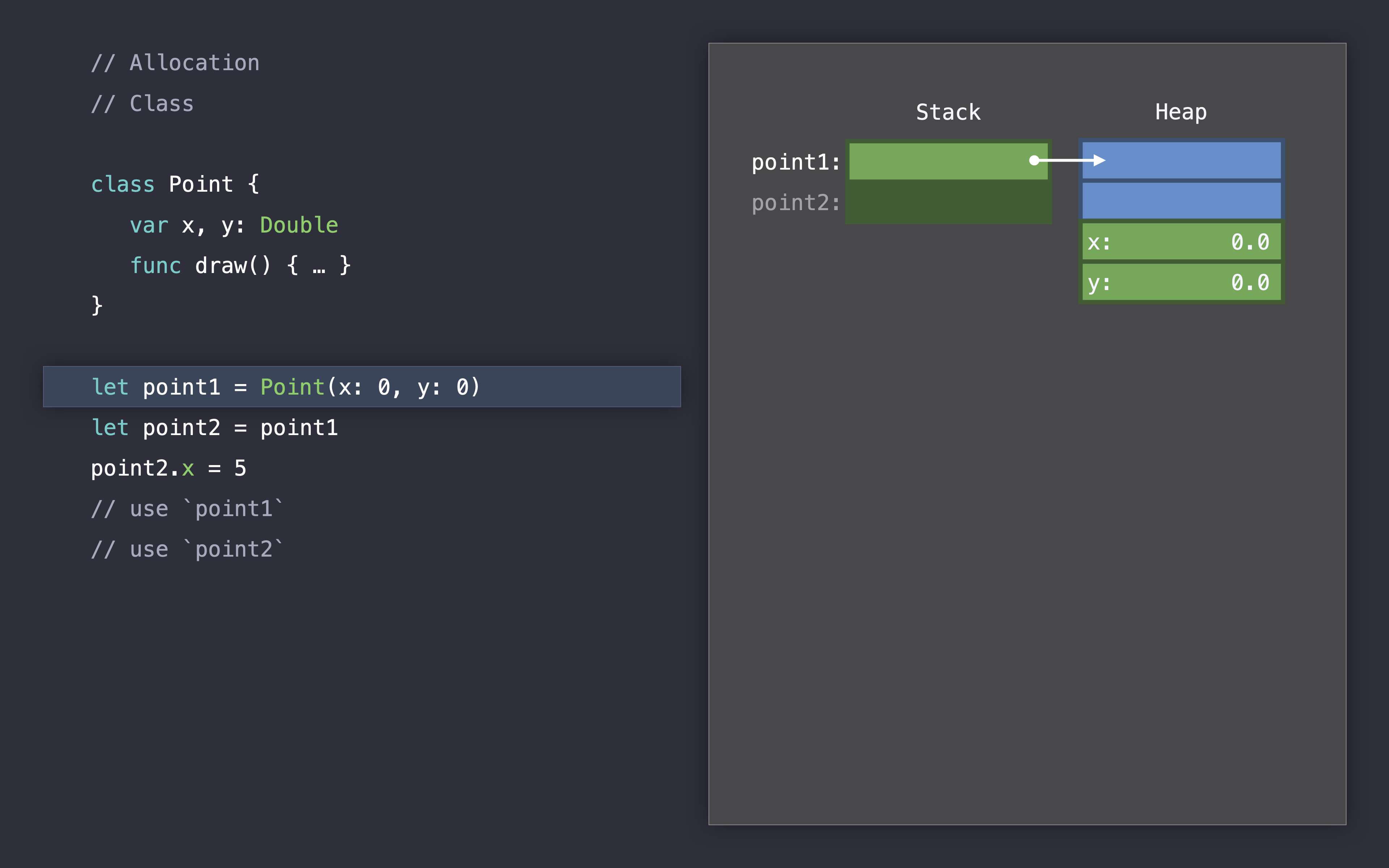 let point2 = point1, 포인트1을 포인트2에 할당하면서 2개의 참조를 가지게 됩니다.