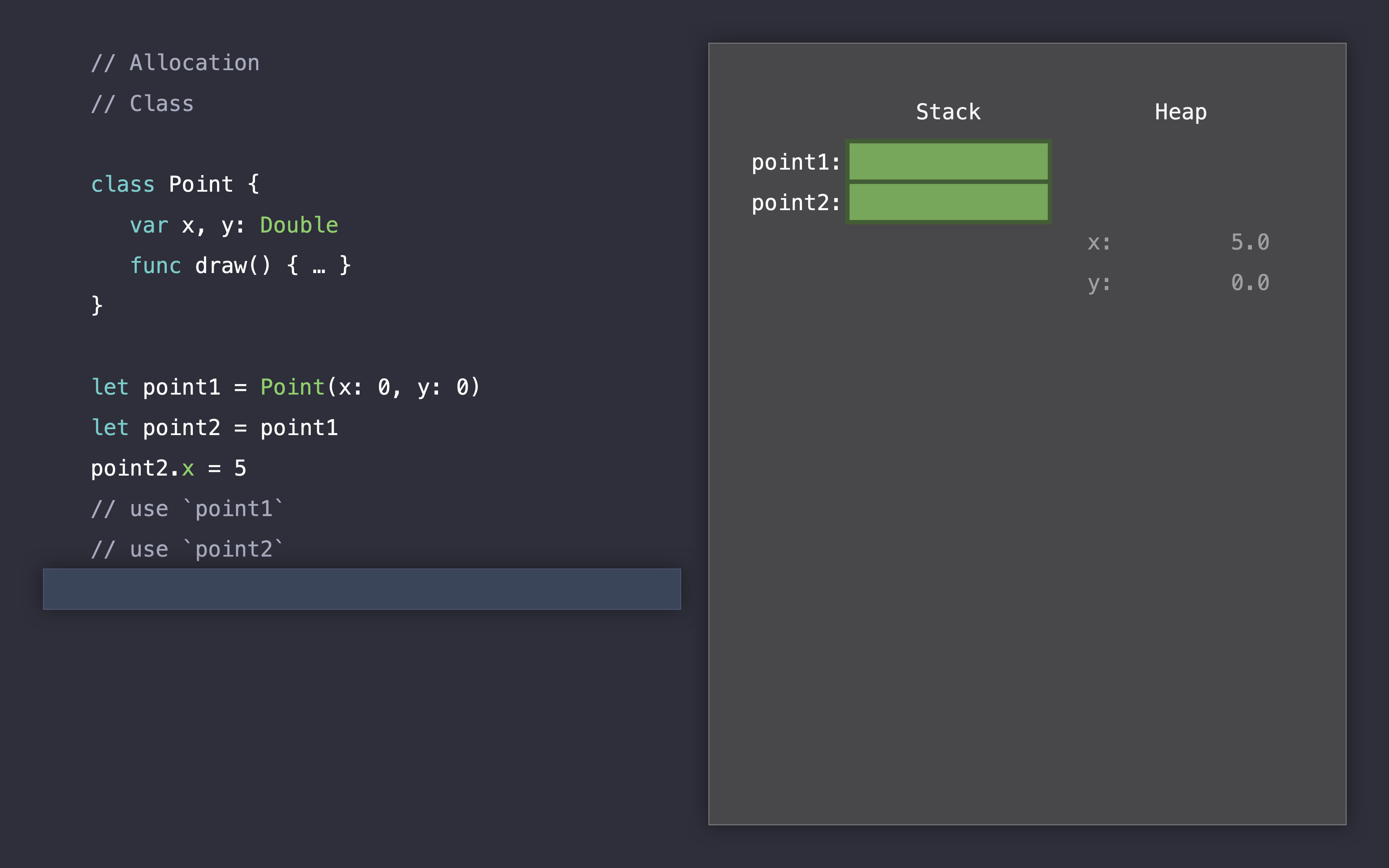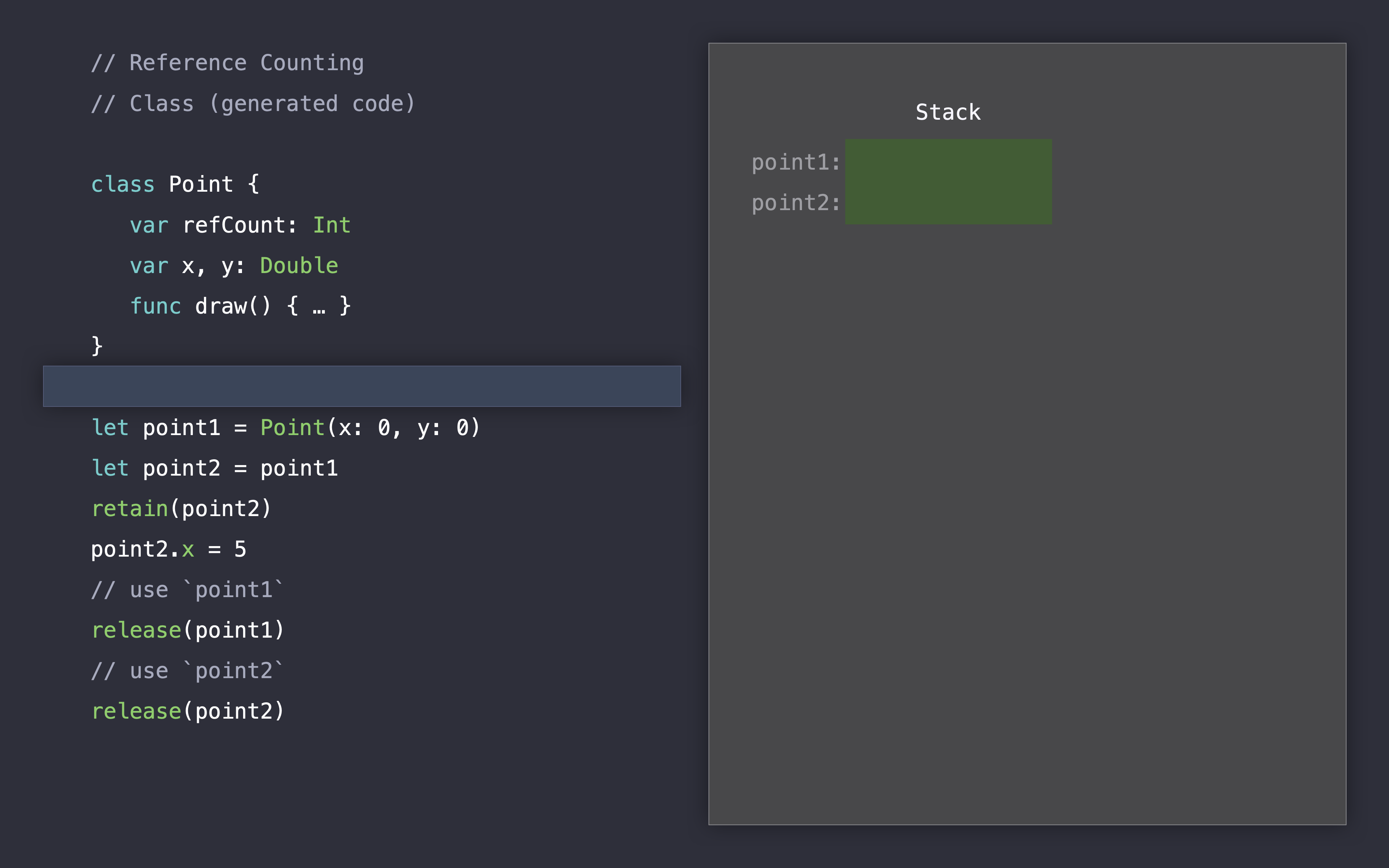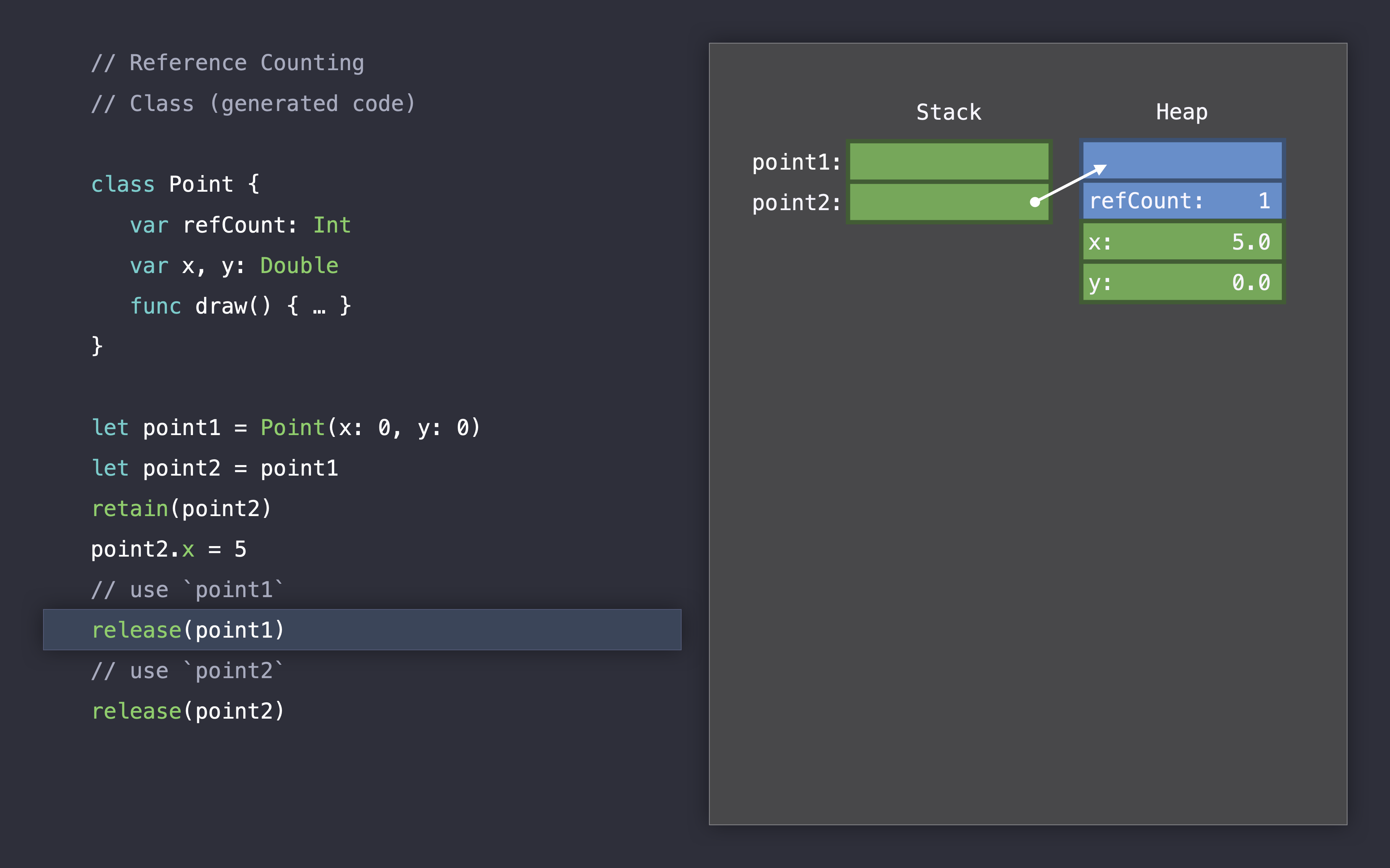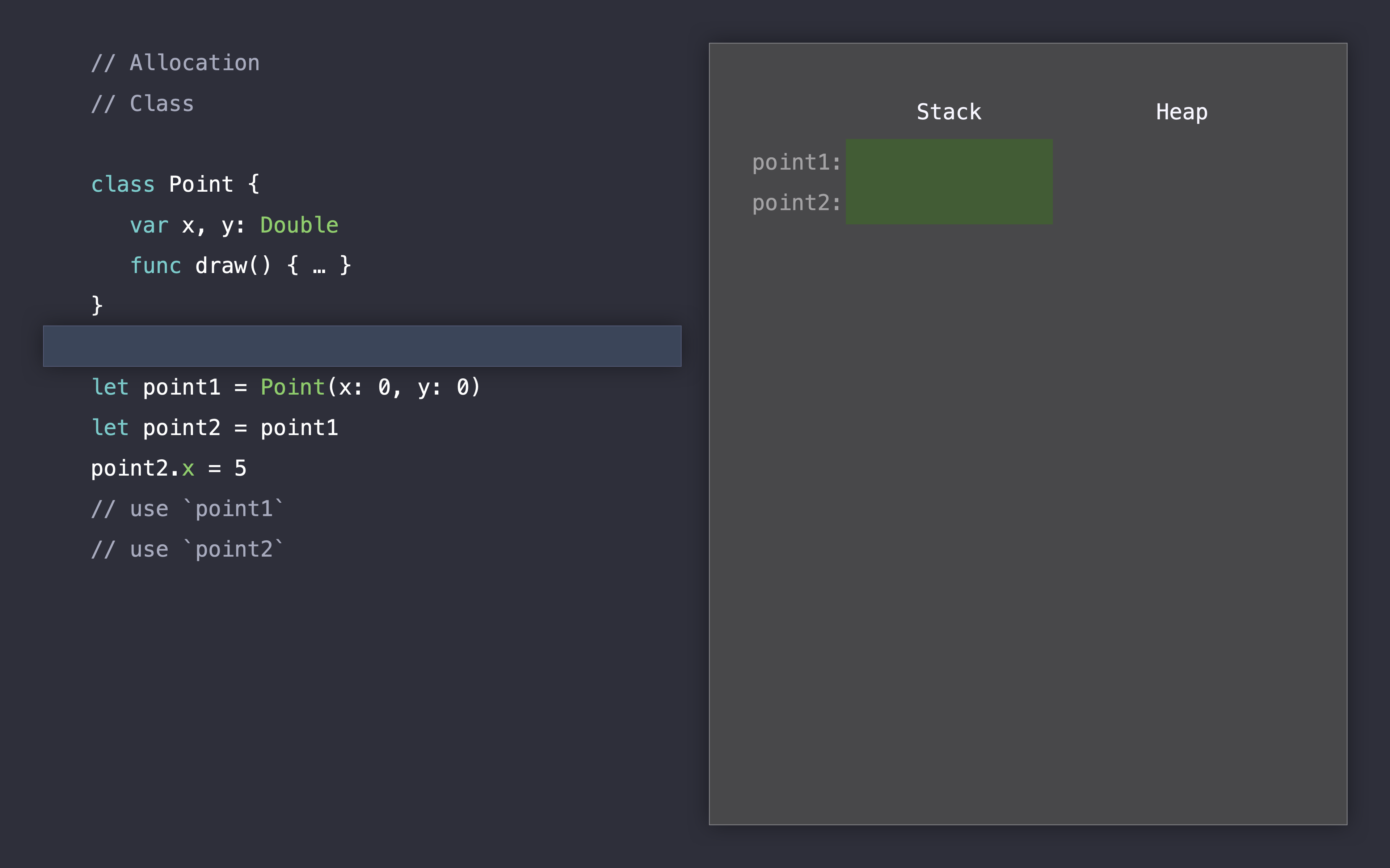 let point2 = point1, 포인트1을 포인트2에 할당하면서 2개의 참조를 가지게 됩니다.