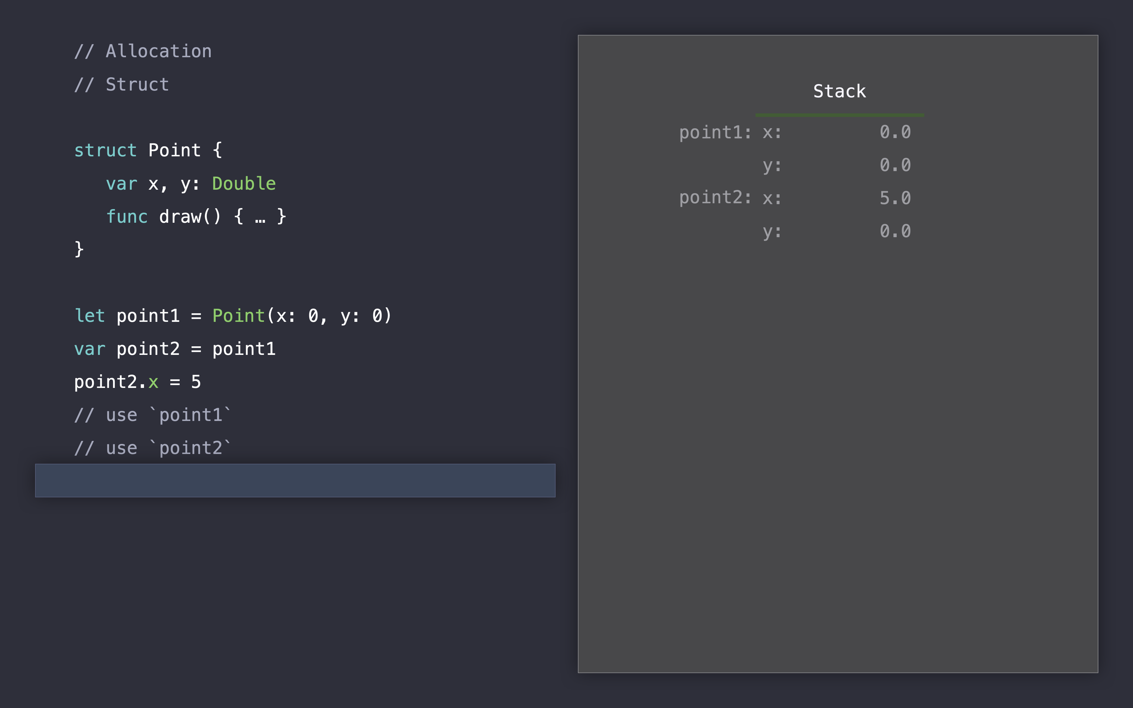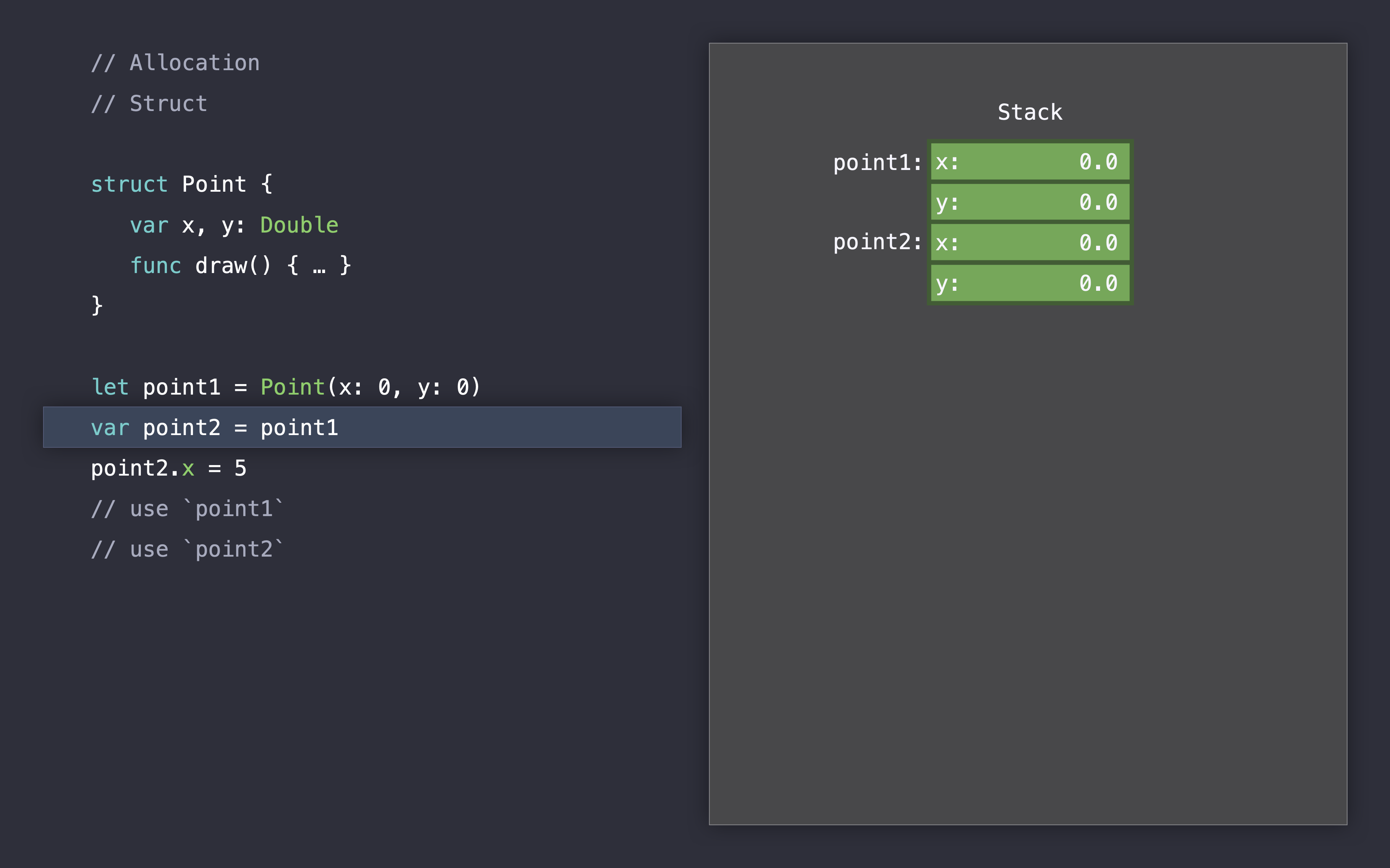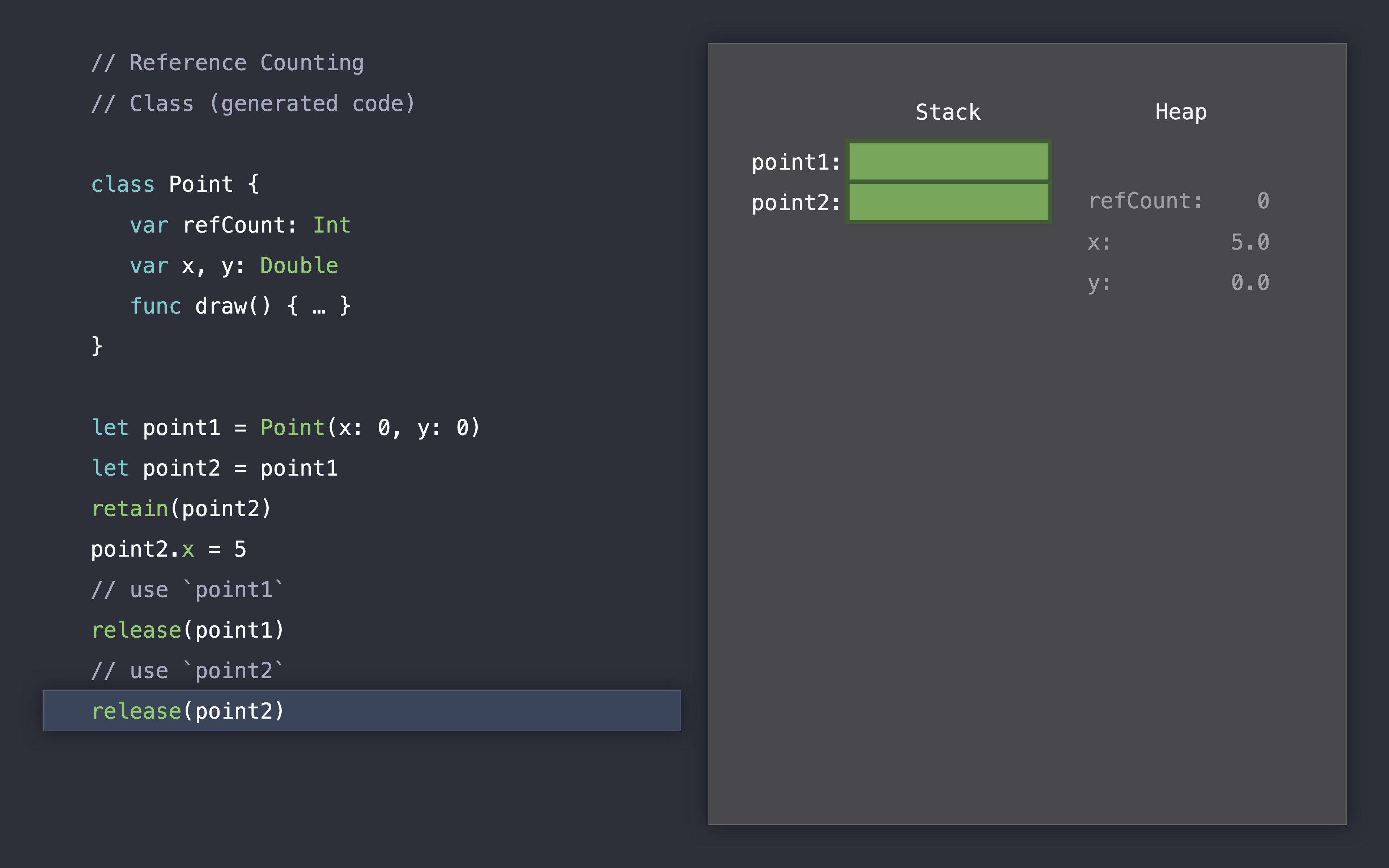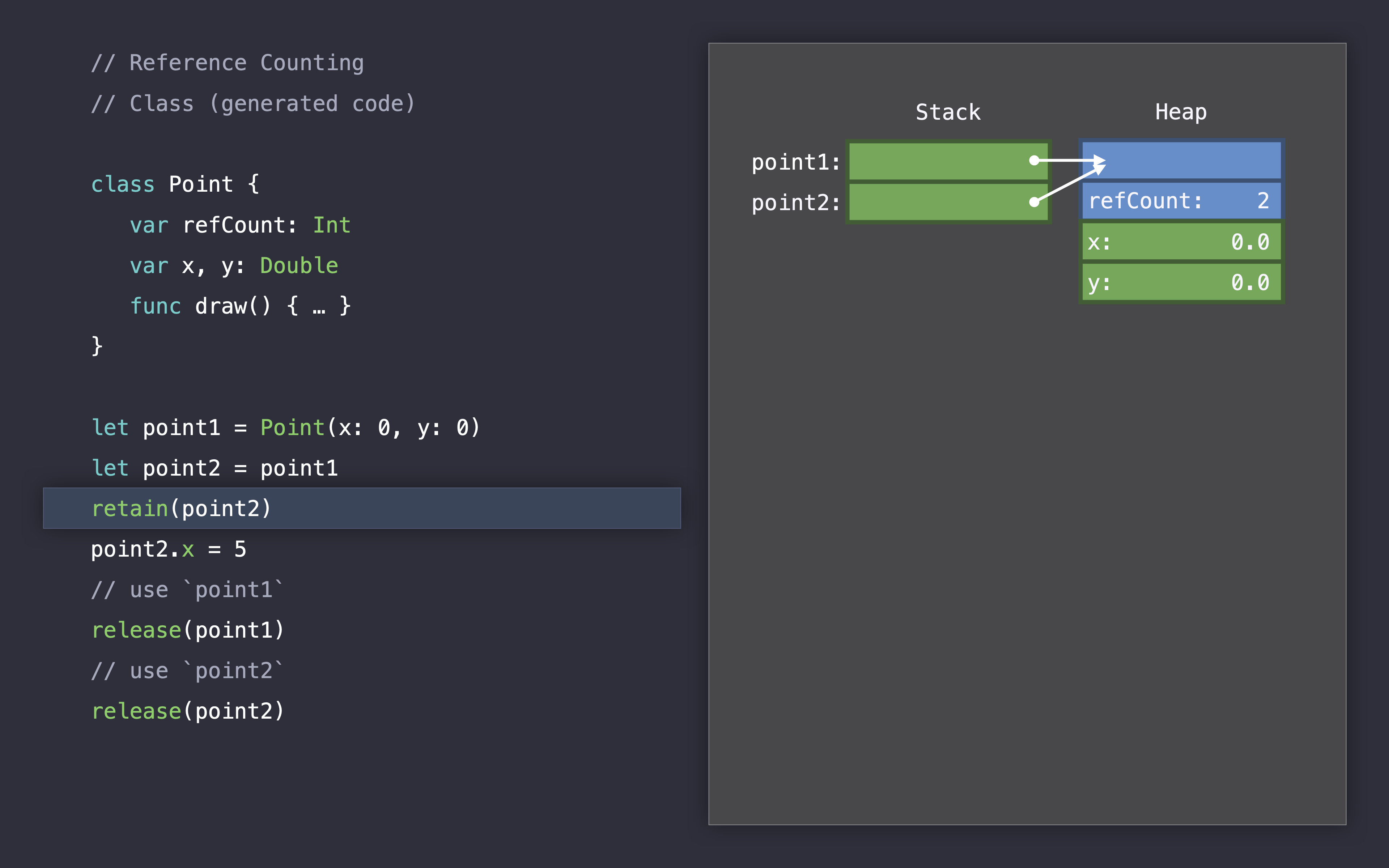 let point2 = point1, 포인트1을 포인트2에 할당하면서 2개의 참조를 가지게 됩니다.