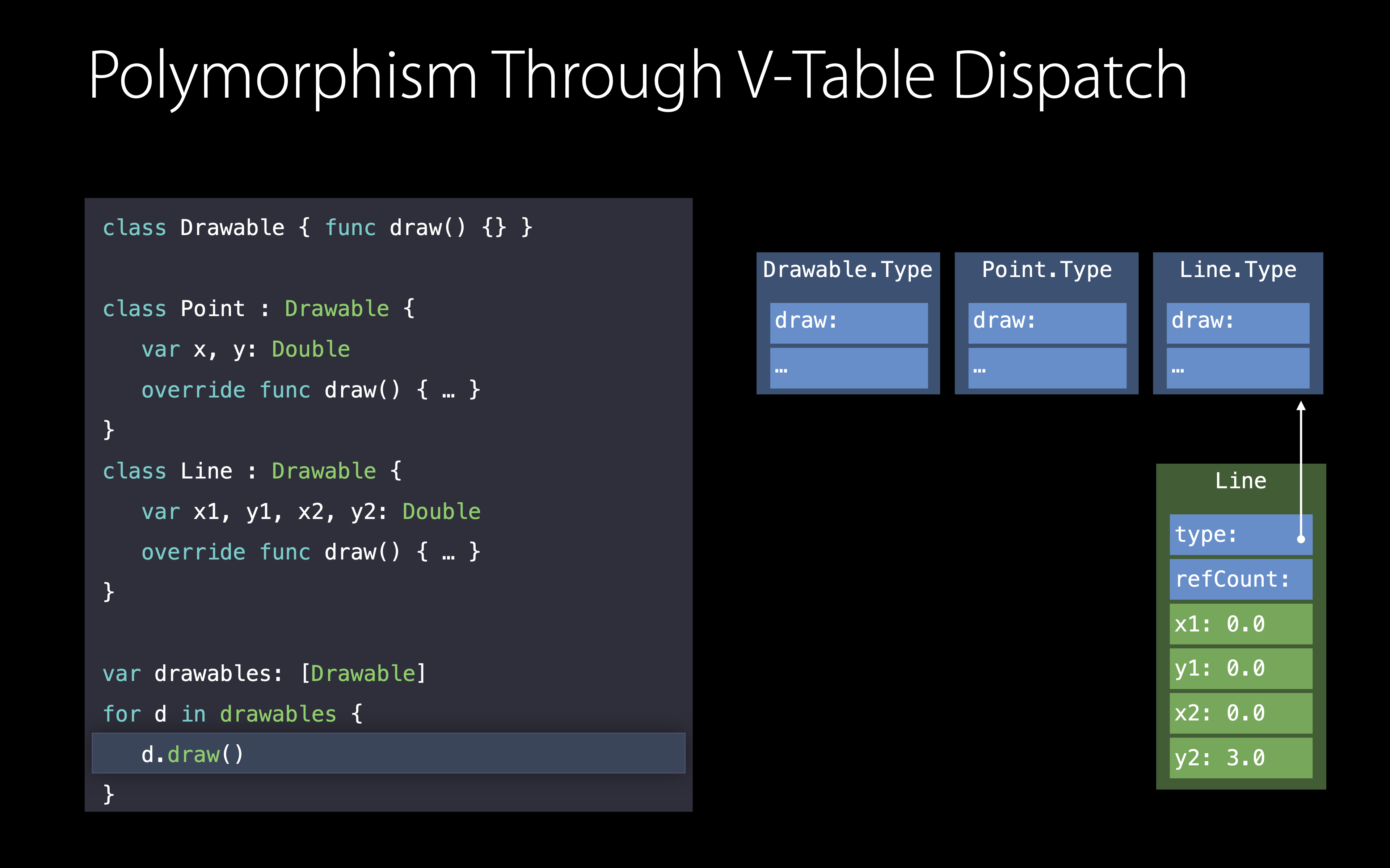 우리가 draw를 호출할때 컴파일러가 실재로 생성하는 것은 타입과 정적 메모리의 virtual method table이라고 불리는 것을 찾아보는 것입니다.